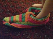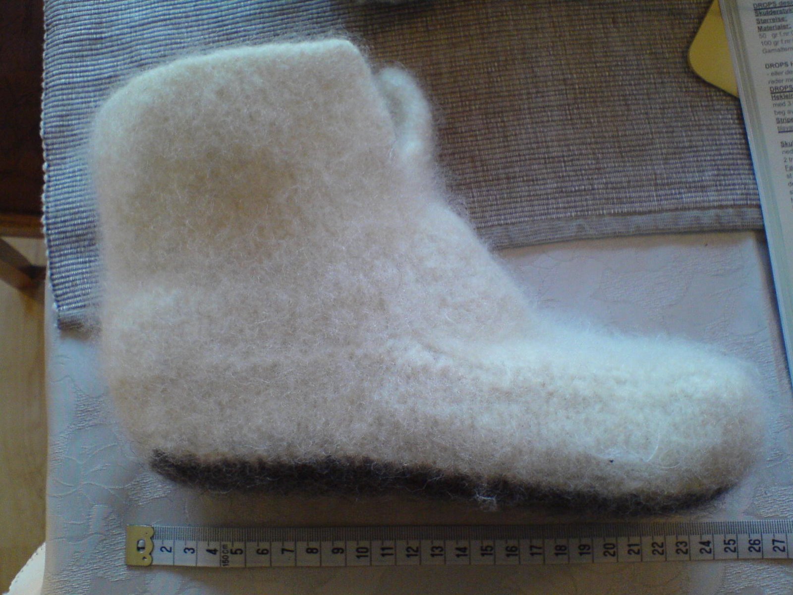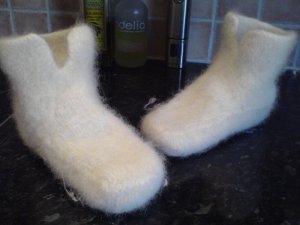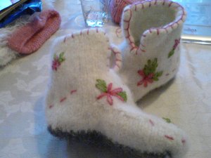 Runde to med tøfler til Mathilde er i vaskemaskinen på tredje vask. mulig jeg må en tur på husfliden og se på hva slags garn det egentlig er brukt i den oppskrifta… Jeg tenkte atte kanskje hvis pinnene og fastheten passet… Jeg var fast bestemt på å få de ferdig til ho i dag og strikket til tolv og tovet til i ett-tia i natt. gjett om jeg angrer på det nå som de alikevel ikke ble ferdige!