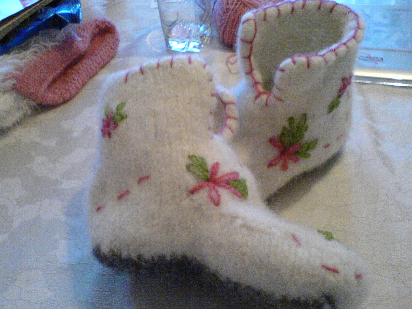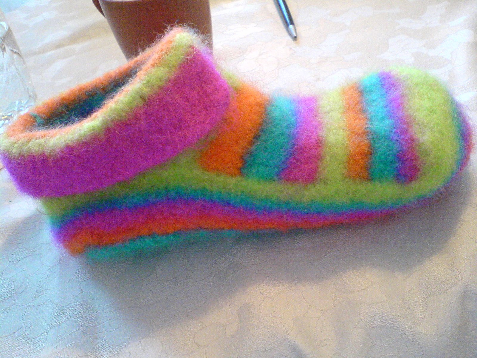 Nå er det kaffe til frokost. Når tøflene endelig blir små nok til småfotene skal jeg brodere greier på de med rosa tråd. kunne gjort det før toving, men jeg leste et sted at broderingen ville krympe mindre så da tenkte jeg at jeg skulle vente litt med det.