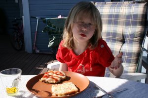 I går spiste vi middag på terassen for første gang i år og etterpå hjalp M meg med å lage garnnøste av det lilla garnet. Jeg kom til å tenke på etterpå at garn sikkert har det bedre i lengden hvis det får være løst hespet enn stramt surret i en ball, men jeg hadde lyst til at M skulle få hjelpe litt til også. Da jeg spurte hva vi skulle strikke av garnet var ho ikke sen med å fortelle at ho trengte nye leggiser og at det ville bli vidunderlig med lilla leggiser. Jeg prøvde å strikke med pinne nr 5, men det ble litt i største laget så jeg skal vente til jeg får frigjort noen litt mindre. Jeg holder på med flere strikkeprosjekter, og nå er det rett og slett ikke flere pinner igjen. Når jeg tenker meg om trenger jeg pinner til pulsvarmerne også så det er kanskje best å gjøre seg ferdig med noe nå. Hvis jeg spør sjefen vil ho sikkert si at det er på tide å gjøre ferdig piratpannebåndet hennes. Selv om det er sommer. Pannebåndet fant jeg i en artig men noe deprimerende strikkeblogg etter at jeg søkte på «headbands» på knittingpatterncentral.com.