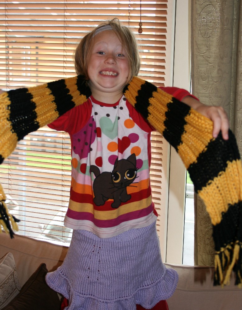 Skjerfet ble med på handletur senere og på tur med Misty og det er offisielt godkjent som superskjerf som ikke klør. Ho er litt bekymret fordi det også er et Smygards-skjef (Eklingene i Harry Potter), men vi har bestemt oss for at det ikke er Bodøglimt sin feil og at det mest sannsynlig kommer til å gå bra alikevel. Forresten så er skjerfet strikket med «nillegarn», et som heter Topp til Tå. pinner nr 7. Full fart frem og tilbake med ti omganger på hver farge. Hvis noen skulle lure, altså.