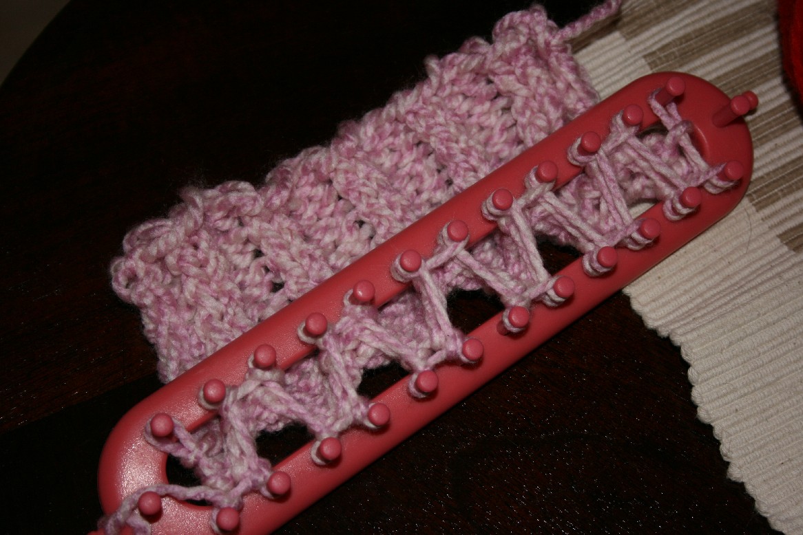 Strikkeramme med skjerf på, to rette og to vrange. Presto!