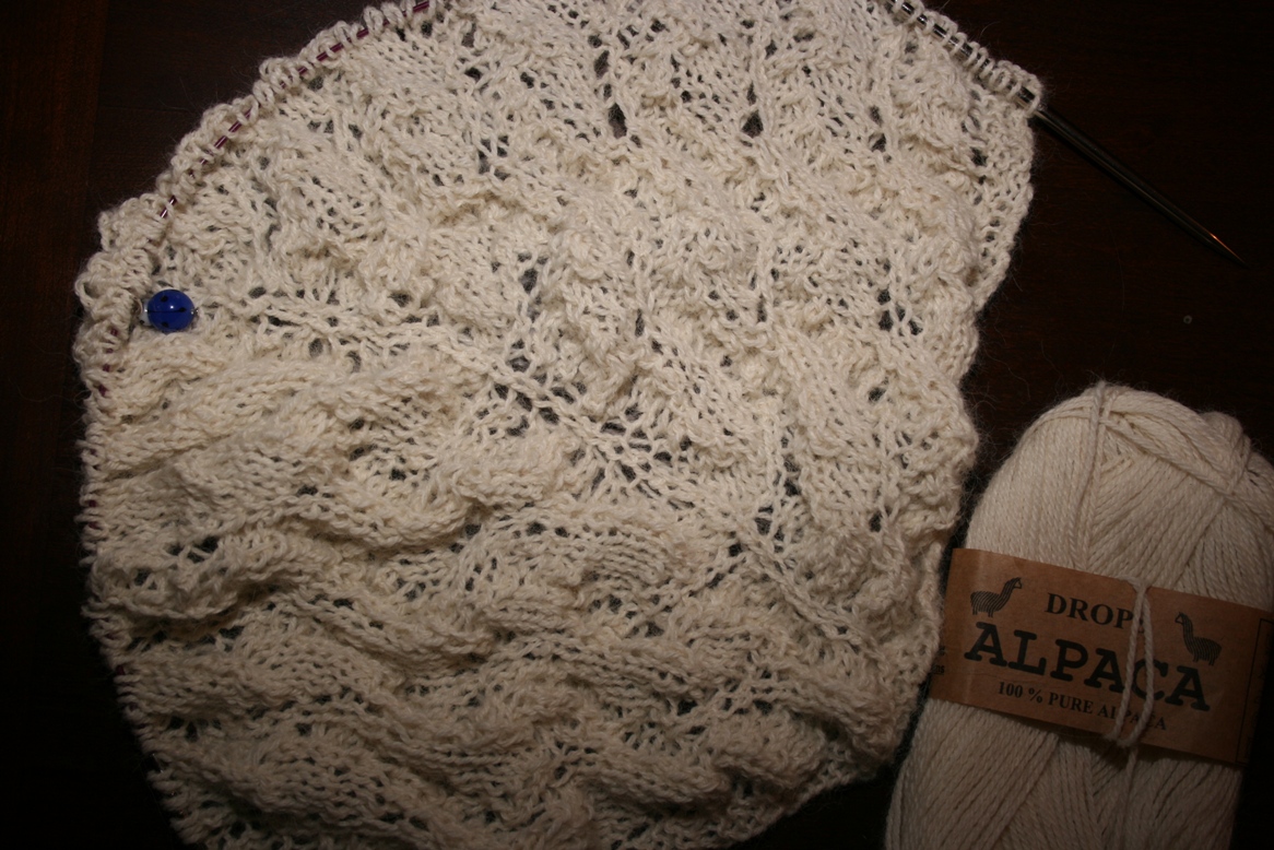 Jeg er kommet langt på pleddet, jeg gikk tom for garn- men nå er det snart full fart igjen…