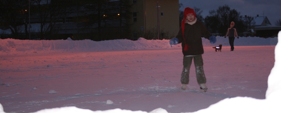 Søndag sydde jeg noen enkle skøytetrekk til Mathilde og en veske ho kunne ha de i når ho drar mellom hjemmene sine. Vi hadde tenkt å pusse på skøyteskoene også, men de var så mye skadet at skopuss ikke ville bite på. Etter nærmere studering så jeg at skøytene allerede var malt, kanskje både en og to ganger. Mathilde fikk fritt valg i hylla med maling på jobb og etter å ha tenkt gjennom valgene nøye og vel endte ho på … lilla. (Bombe…) Lilla Metallic for å være presis.