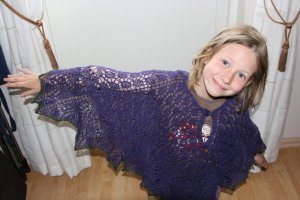 Mathilde ble for øvrig veldig fornøyd med ponchoen sin. Den blir helt perfekt til ferien. Ho ser ut som dattera til Batman med den der ho flyr rundt på rullende sko og flakser med armene. Mønsteret vises ikke helt godt på bildet men det er Swallowtail shawl som jeg bare har strikket dobbelt. Jeg laget en liten krage først og ho har bestilt hette til den og. Det kan bli tøfft tror jeg.