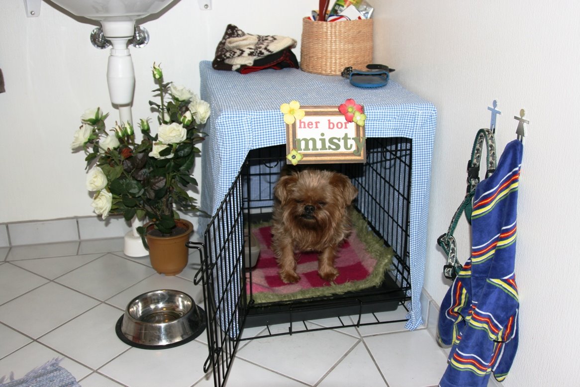Buret har fått fint blått smårutet trekk, ho har fått en plante utenfor, knagger til tingene sine og et eget dørskilt sånn at det ikke skal være tvil om hvem som bor der. Teppet er til vask og tørker forhåpentligvis før det blir leggetid.