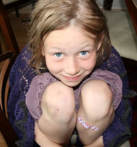 Det vises kanskje ikke så godt, men knærne til Mathilde er altså blå og gule. Om jeg har gitt ho juling? Nei, det har ho klart helt fint selv. På rullesko. Ho og Malin skulle fortelle om hvordan dette skjedde, og det var noe med et gjerde og høy fart og lissom og sånn. Mye lissom og sånn.