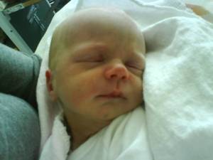 Mandags kveld ble jeg lei og bestemte meg for å komme og hilse på og da klokka var halv fire på natta hadde jeg klart det. 2590 tung og 49 cm lang. Jeg er ikke store kroppen enda, men det skal vi nok fort ordne. Nå koser mamma og jeg oss på sykehuset og pappa og storesøster kommer hit så ofte de kan. Snart skal jeg hjem og styre det store huset. Det blir flott!