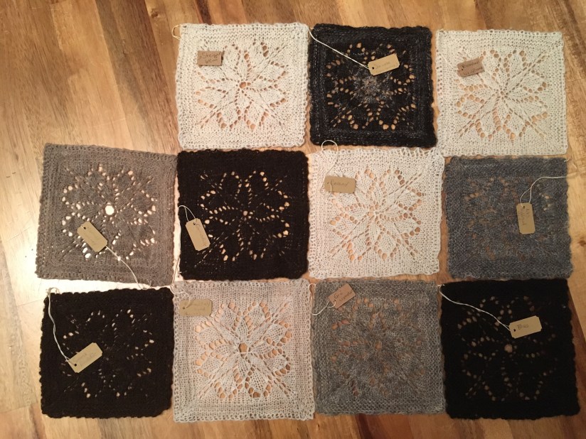 Prosjektet så langt minus to lapper som er ferdig strikka men ikke blokket.
