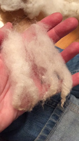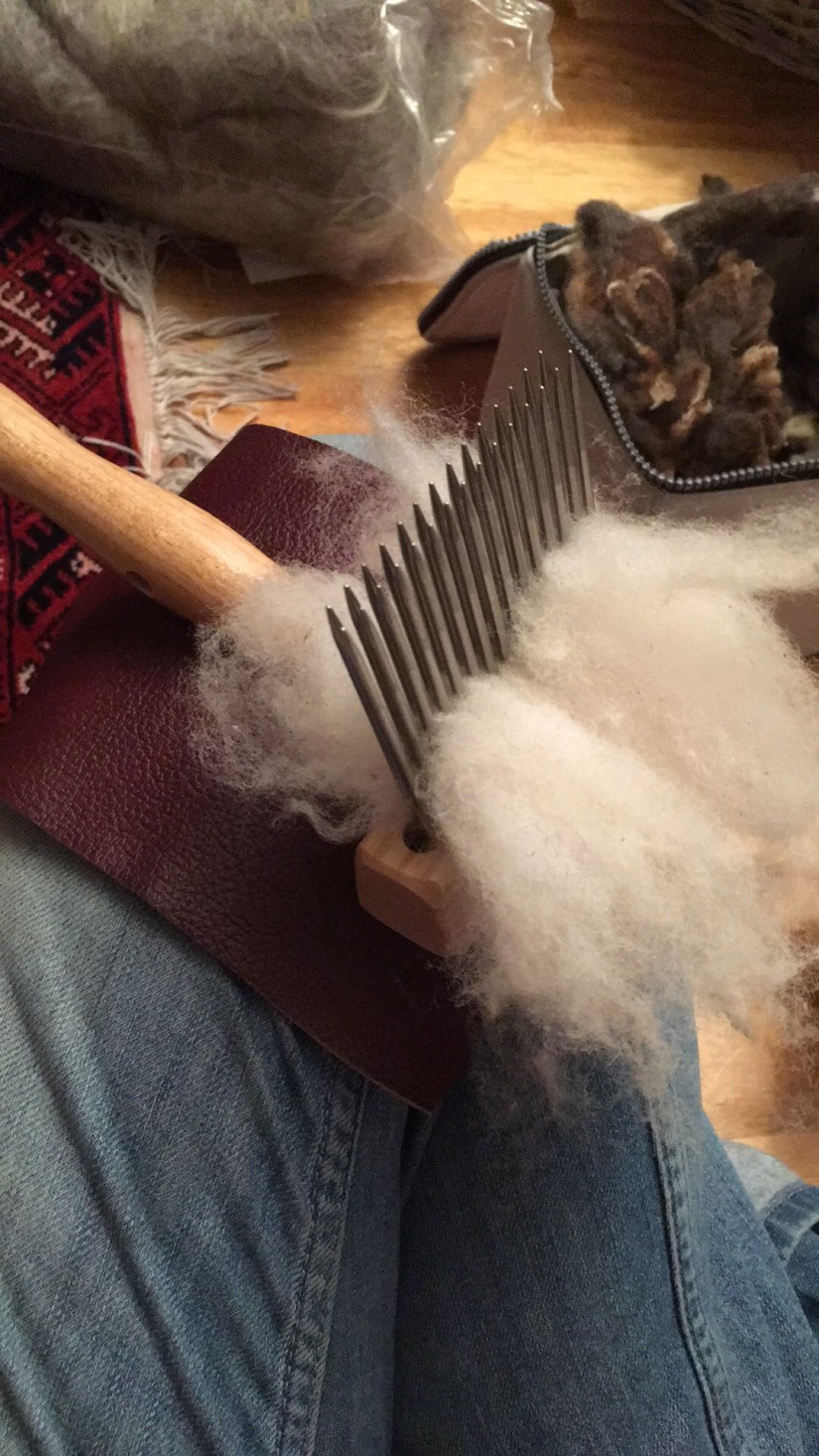 Første ut var en liten prøve nydelig grå wensleydale. Det viste seg at den var full av flass og tovet på midten så den gikk ganske elegant i søpla. Jeg har brun Wensleydale som jeg vet er finere men den er ikke vasket enda.