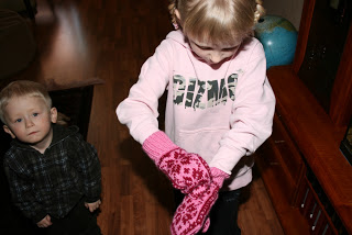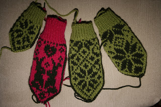 Vilde og Niklas kom innom på lørdag for å avlegge rapport om hva som hadde skjedd i den lange tiden vi hadde vørt borte og Vilde fikk vottene sine og var kjempefornøyd med resultatet. Ho fant ut at ho også trengte piratvotter, men at Bestemor nok var den rette til å strikke de.
