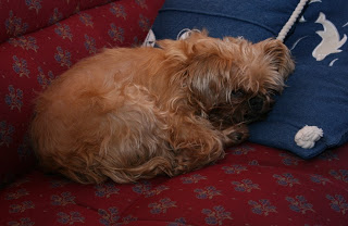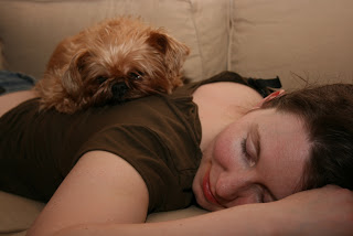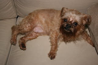 Misty ble selvsagt ellevill over å få oss hjem og etter å ha sjekket at huset var som det skulle inntok ho koseposisjon på fanget til Roger og leste Pondus for ham. Snille hunden.