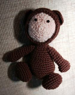 Jeg har heklet en liten bamse, men denne mangler jeg øyne til. Får se om ikke jeg finner noe etter hvert, den ble ganske liten- bare ca 15 cm høy.