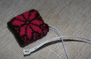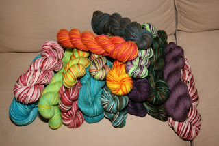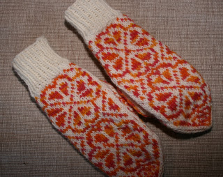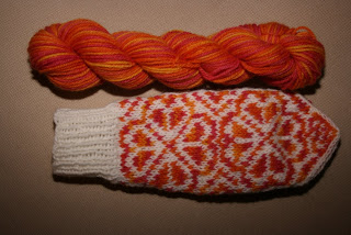 Før har jeg bare farget sokkegarn og merinoull, men nå prøvde jeg meg på vanlig ullgarn også. Resultatet ble knallbra, men 17 hesper med garn var kanskje litt i overkant. 13 av de var 100 eller 150grams hesper. Ullgarnet delte jeg opp i 50-gramshesper med den baktanken at de skulle være til votter og da mest til mønsterstrikkede votter som selbuvotter. Jeg prøvestrikket en vott med et gult-orange-rosa garn og om jeg så får si det selv så ble det knalltøfft!