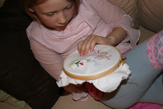 Mathilde ble satt til å brodere da vi var på husflidsstua. Å tegne med tråd kalte de det. Ho tegnet en blomst, et hjerte, to sommerfugler, og et dødningehode. Jepp. Et dødningehode. Ho har arbeidet ivrig med broderingen og til slutt klippet vi ut motivet og monterte det i en liten ramme med speil.