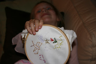 Mathilde was set to embrodiery at the spinning group. Drawing with yarn, they named it. She drew up a flower, two butterflyes, a heart, a sun and a skull. Yup. A skull. Them old ladies just shook their head and mumbled something about kids today. We mounted a part of her piece in a small mirror with frame and she`s soo proud.