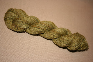 Monday Mathilde and I attended a spinning group and I finally got help to figure the wheel out. I was just about to put it on display and rather get a new one, but now it spin perfectly. At spinning class everyone spun predrafted unwashed wool for practice, but patient as I am I couldn`t do that for long. I have tested some of my dyed green merio and finished a small skein. I rather like it, it is a two ply fingering weight. It has good balance but is uneven here and there. I think I will keep it as is, I guess it is only about 30 grams anyway.