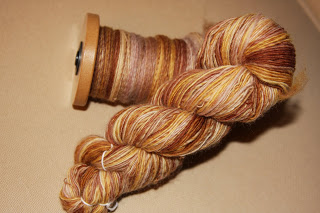 Absolutt ikke lei av å spinne entrådinger etter disse, så jeg har farget noe BFL i lilla, sort og blått, og denne ble nydelig midnattsmørk og dyp. Av alle fargeprosjektene mine er nok denne den jeg ble mest fornøyd med. Det var mye farge til overs i gryta etter at den var ferdig, og det måtte en del skyllinger til , men jeg klarte det uten å tove ulla.