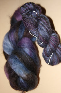 Absolutt ikke lei av å spinne entrådinger etter disse, så jeg har farget noe BFL i lilla, sort og blått, og denne ble nydelig midnattsmørk og dyp. Av alle fargeprosjektene mine er nok denne den jeg ble mest fornøyd med. Det var mye farge til overs i gryta etter at den var ferdig, og det måtte en del skyllinger til , men jeg klarte det uten å tove ulla.