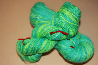 Først prøvde jeg med noe Merinoull som jeg hadde farget selv i en nydelig syrlig lime og turkisblanding. Jeg laget to av denne fargen, og den andre sendte jeg til min swappartner i høstens bytting på spinneforumet. Tilbake fikk jeg en pakke med myyyke sorter ull jeg aldri har prøvd før. Ingen av de faktisk, cormo og soya, ull/kasjmir, angora (!) og en kjempefin turkis glitrete sak jeg ikke vet helt hva er men som er utrolig myk og deilig (og som jeg tror skal bli et skjerf til Mathilde i julegave- ikke si noe…)